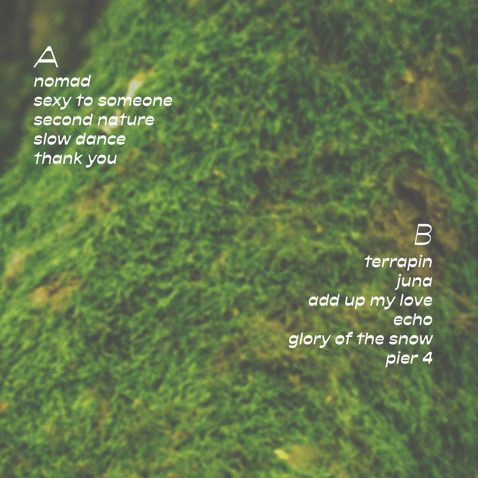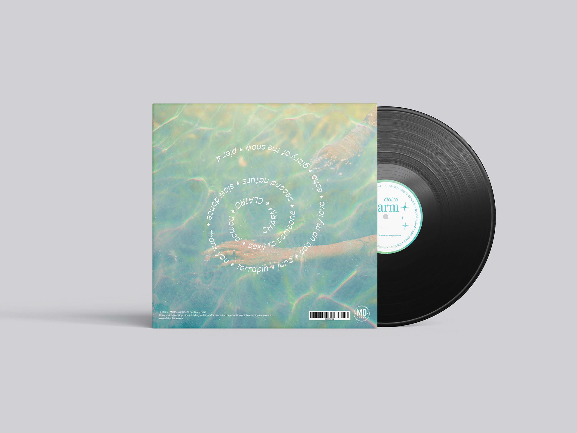 For my back cover, I embraced the organic, flowing nature of the chosen images, arranging the track listing in a spiral shape and including small star elements between songs to carry over the same motif from the front cover title and record sticker.
