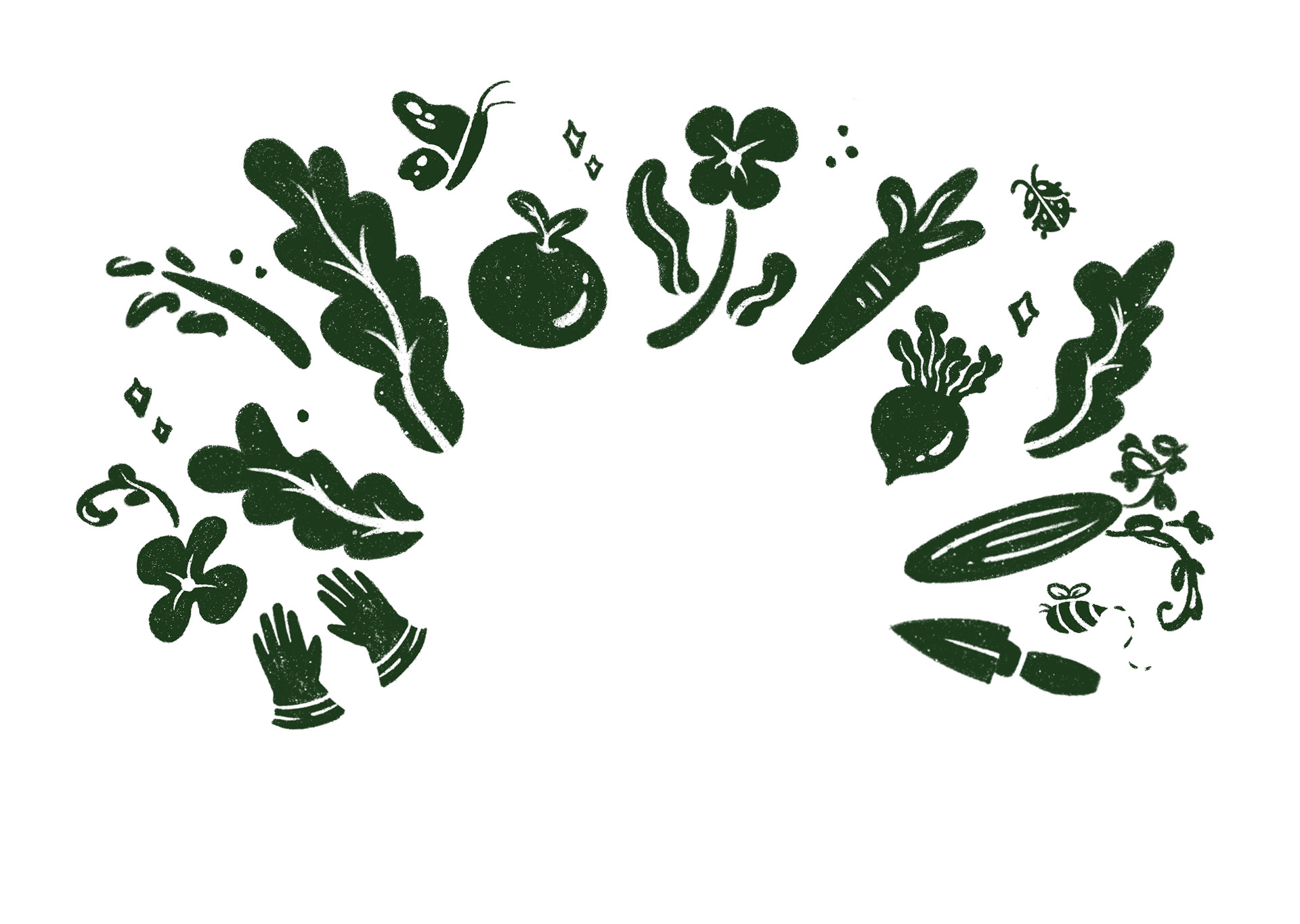 As I refined my illustrations for both a larger and smaller design, I finalized the elements that would appear, including a variety of produce, helpful pollinators, and gardening tools.