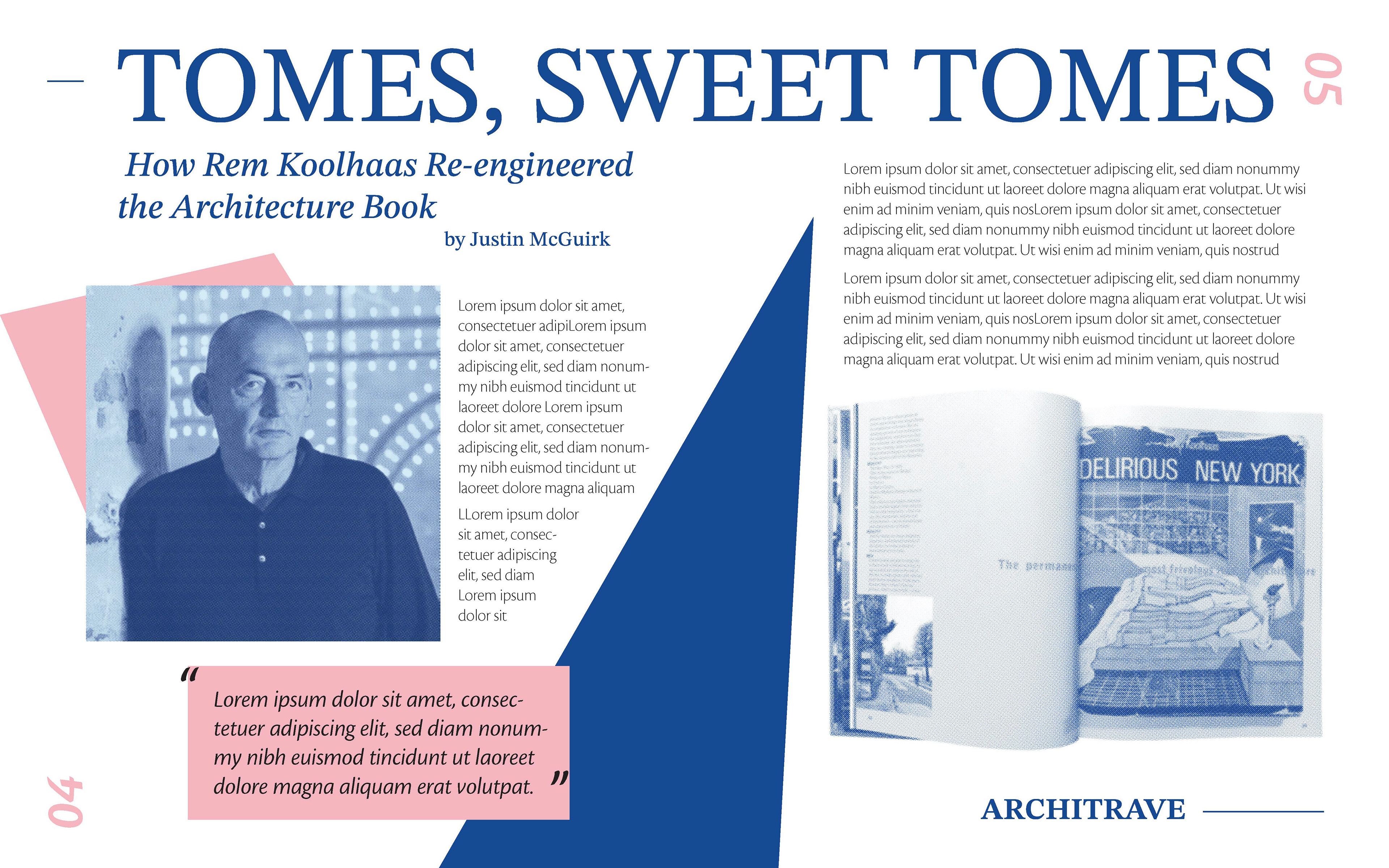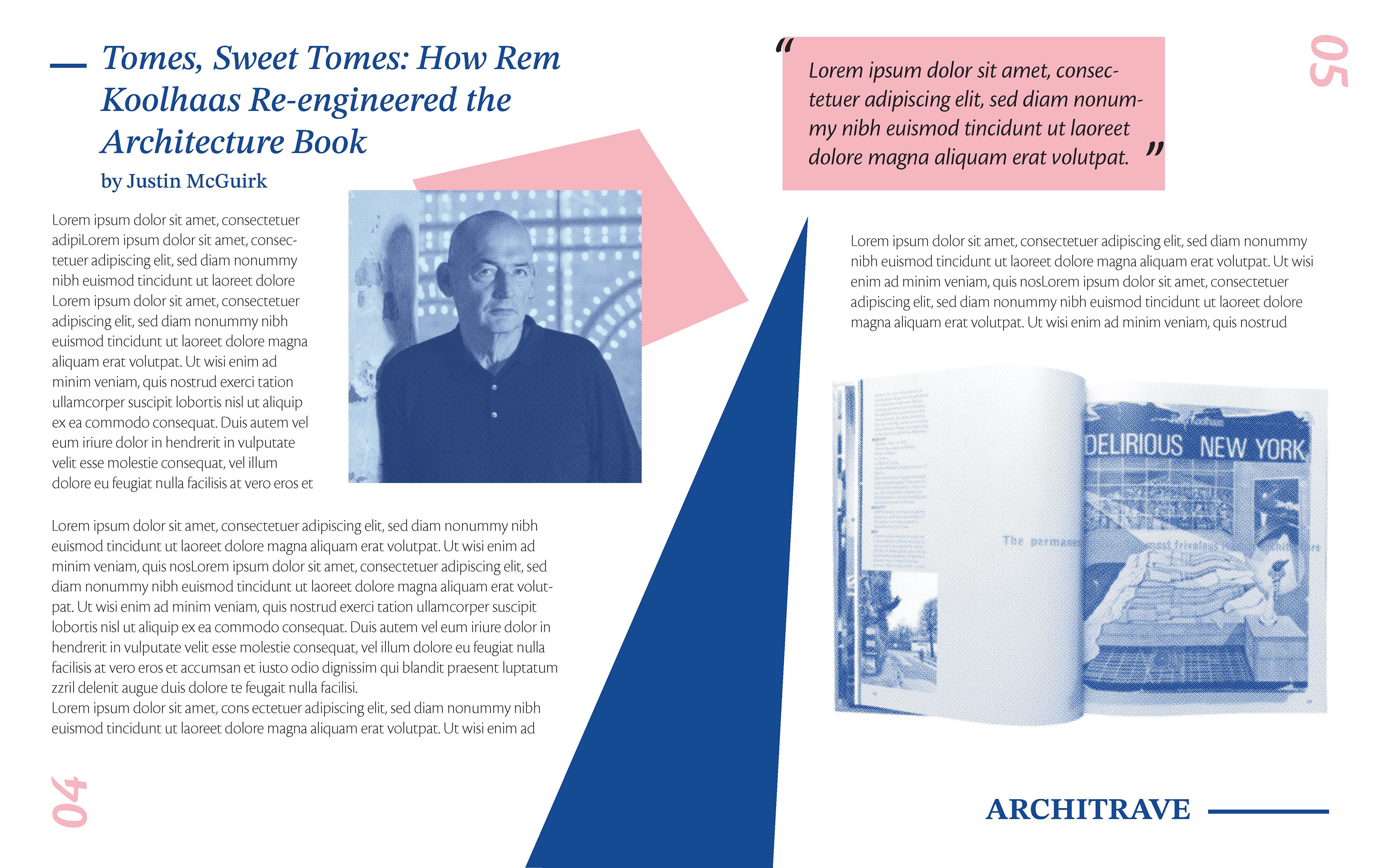 In my early compositions, I played a lot with the size and arrangement of the elements, trying to balance the images with the text and additional shapes on the page. From the second draft to the final, I refined the placements of the page elements, incorporated more lines, added more typographic contrast, and shrunk the text size of the "Architrave" magazine title.
