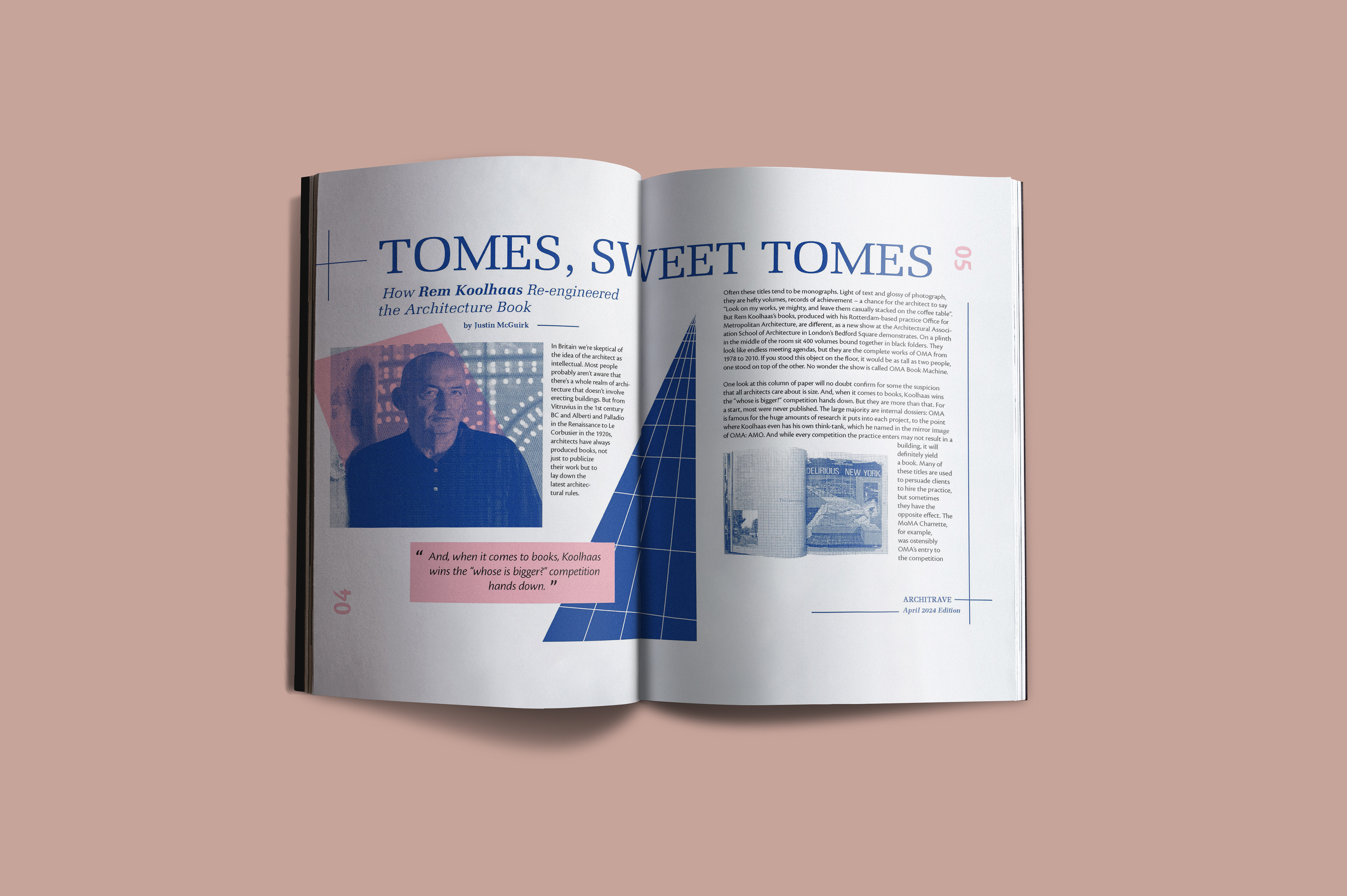 For this simple two-page magazine spread, I was assigned an article written by Justin McGuirk on Rem Koolhaas' architectural book entitled S,M,L,XL. I was required to include all provided copy, including the title, subtitle, author, magazine title, edition, and body copy, as well as folio.